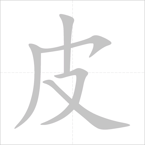 - 皮 (皮 – pí): This character, as we also discussed before, originally depicted an animal hide or pelt, likely stretched out for drying or processing. It later came to mean “skin,” “leather,” or “outer layer.”