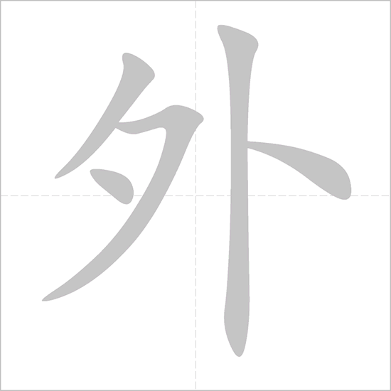 - 外 (wài): This character means “outside” or “external.” It originally depicted a person standing outside a doorway, symbolizing something beyond a boundary or outside a defined space.