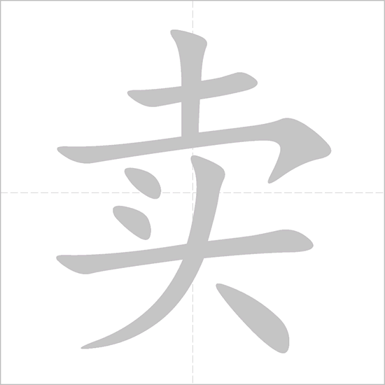 - 卖 (賣 in traditional form – mài): This character means “to sell” or “to trade.” It originally depicted a hand holding a valuable object, possibly for exchange or trade.