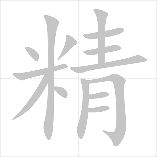 - 精 (jīng): This character originally depicted refined rice (米) with three shining dots (representing purity or essence) above it. It conveys the idea of something refined, purified, or essential. Over time, its meaning expanded to encompass “essence,” “vitality,” “semen,” and “skillful.”