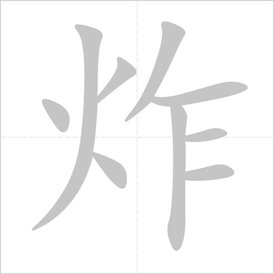 - Original form: In oracle bone script, 炸 depicted meat (肉) being cooked over fire (火), with additional lines indicating the sizzling sound and splattering oil. This symbolized deep-frying or stir-frying.